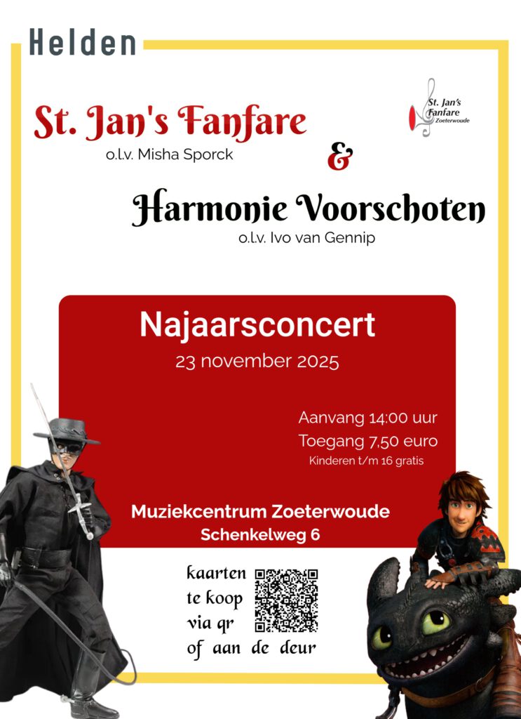 Maak je klaar voor een muzikale middag vol kracht, moed en inspiratie, want St. Jan’s Fanfare en Harmonie Voorschoten bundelen hun krachten voor een spetterend dubbelconcert met het thema “Helden” op zondag 23 november a.s.
