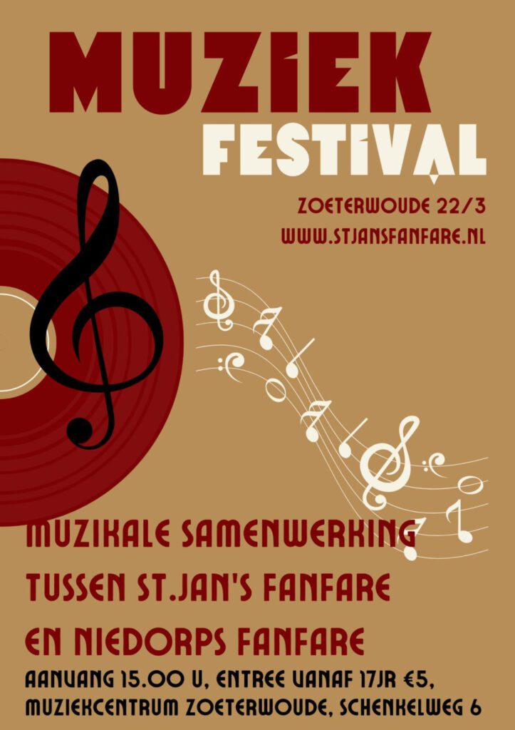 Zondag 22 maart geeft St. Jan’s Fanfare een feestelijk concert samen met Niedorps Fanfare. Zuid-Holland ontmoet Noord-Holland.